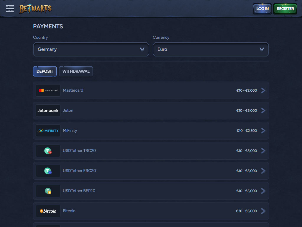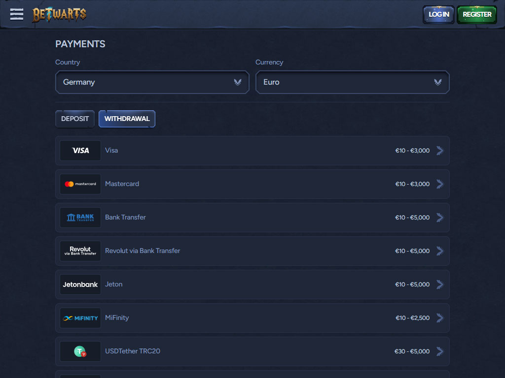 Das VIP-Level basiert auf der Kontoaktivität der letzten 90 Tage, einschließlich Einzahlungen, Auszahlungen und erhaltenen Boni. Sollte Ihre bevorzugte Zahlungsmethode nicht verfügbar sein, kann Betwarts eine alternative Option für die Auszahlung nutzen.
