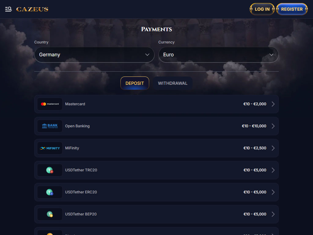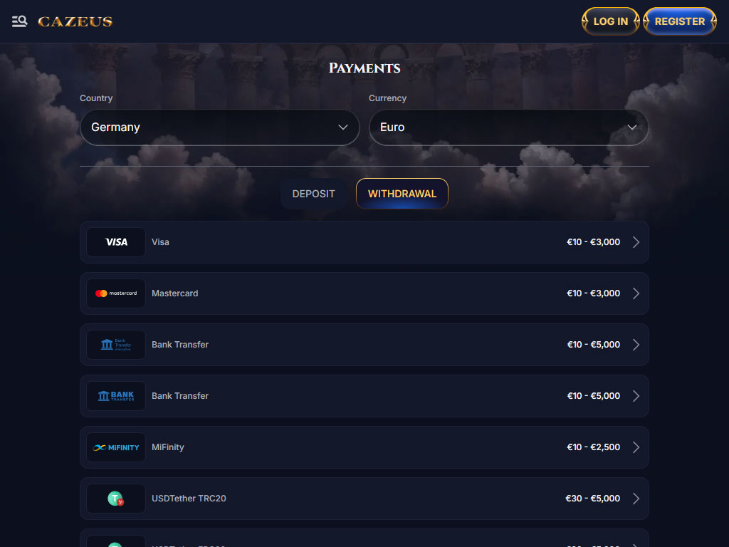 Cazeus-Auszahlungsmethoden mit guter Leistung