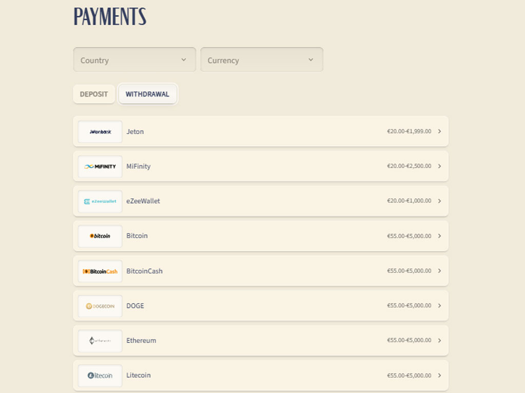 Die Seite bietet eine gute Anzahl an Zahlungsoptionen, wobei fast die Hälfte auf Krypto basiert. Die Leistung variiert je nach Faktoren wie Geschwindigkeit, geografischer Verfügbarkeit und Auszahlungslimits. Zu den derzeit effizientesten Methoden, die von der Seite unterstützt werden, gehören: