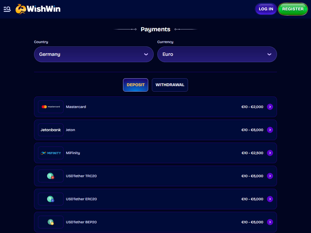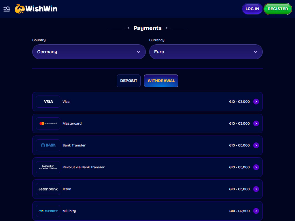 Verfügbare Auszahlungsmethoden bei WishWin