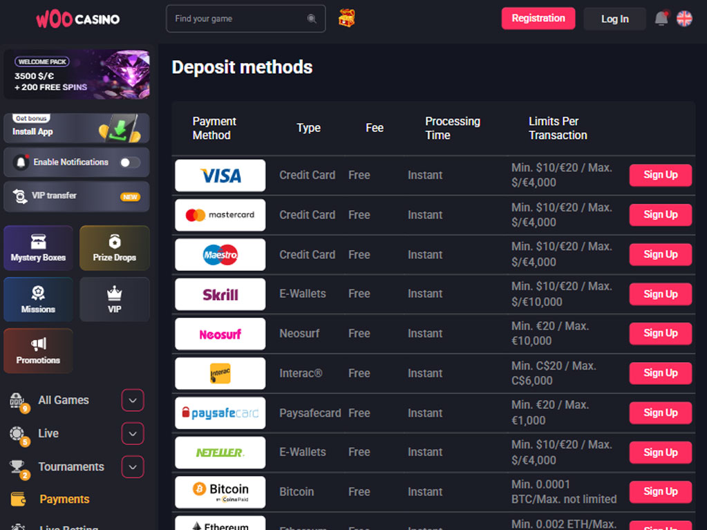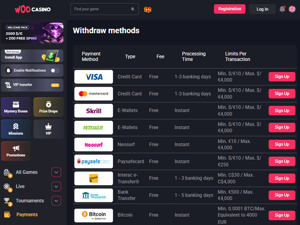 WooCasino Auszahlungslimits