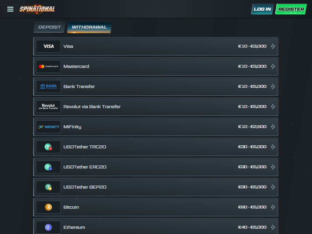 Available Withdrawal Methods at Spinational