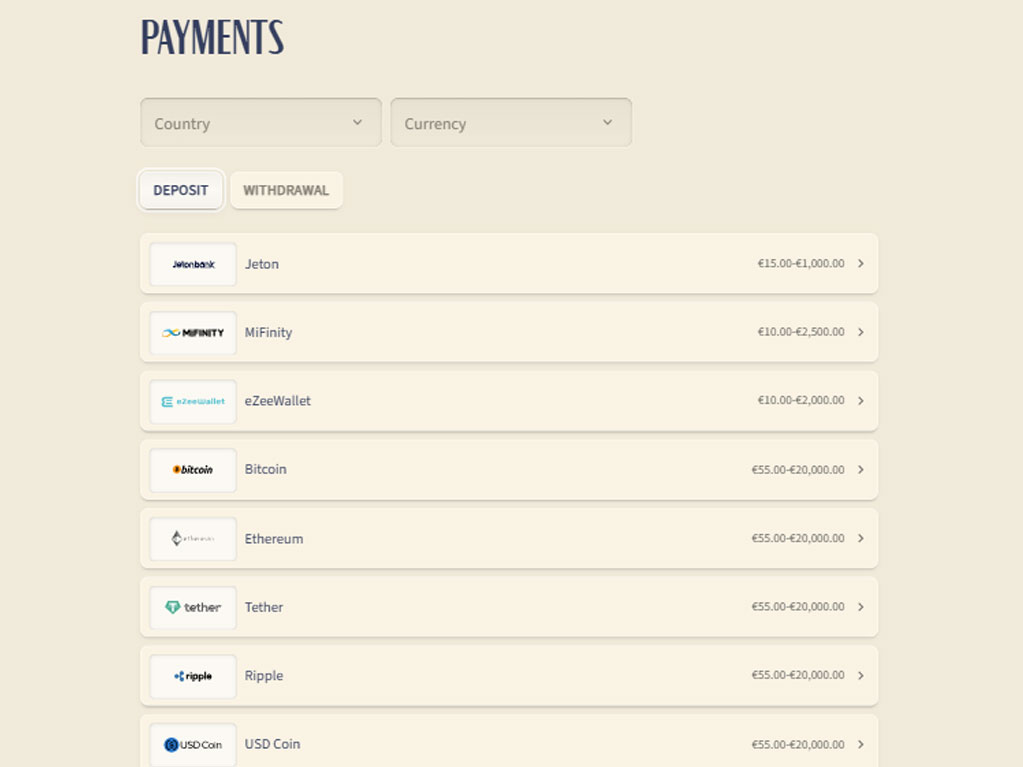 The site offers a good number of payment options, with nearly half based on crypto. Performance varies depending on factors like speed, geographic availability, and withdrawal limits. The most efficient methods currently supported by the site include: